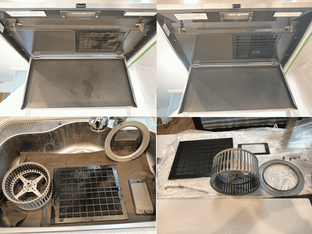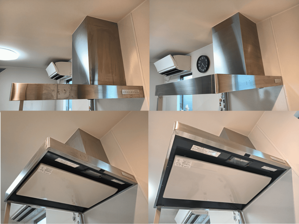 作業はまずキッチンを汚さないようにビニール養生を実施し、分解したパーツを丁寧に並べます。専用洗剤とプロの技術で油汚れを徹底的に分解・洗浄。外側のステンレス部分には「ステンレスコート」で仕上げを行い、ピカッ✨と輝く新品のような仕上がりになりました。